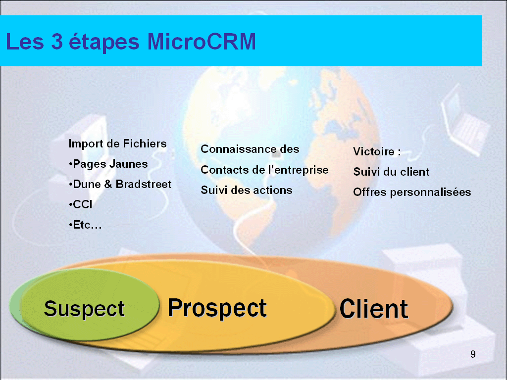 - Gestion du cycle Suspects > Prospects > Clients